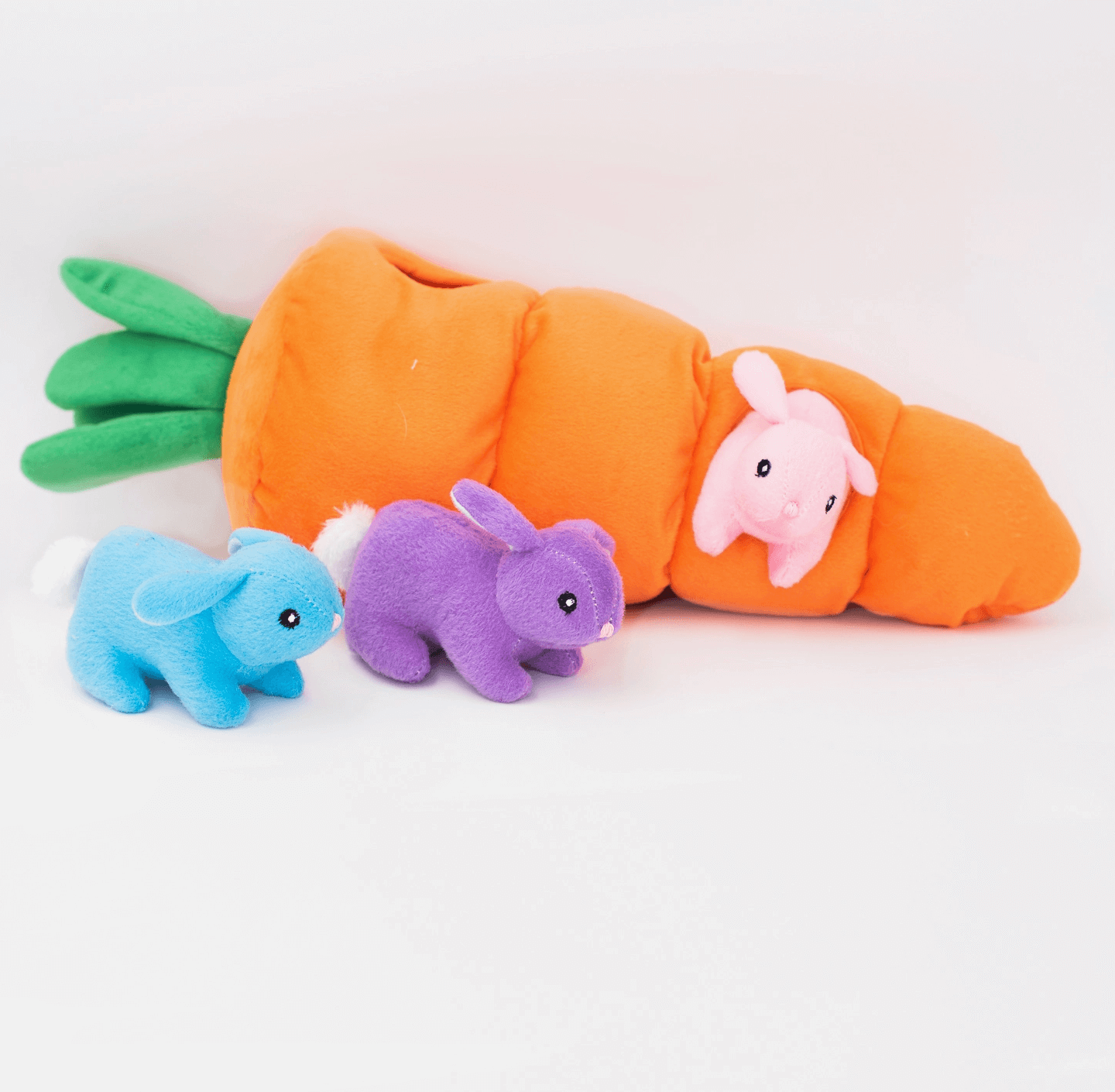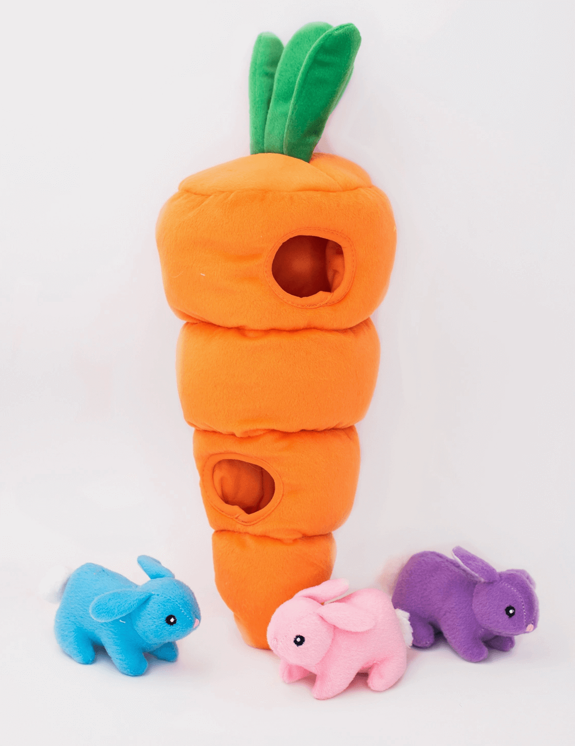 Ce jeu de recherche et de fouille se compose d’une grande carotte en peluche munie d’ouvertures et de trois petites peluches en forme de lapins qui couinent. Placez les lapins dans la carotte et laissez votre chien la fouiller pour les en faire sortir.