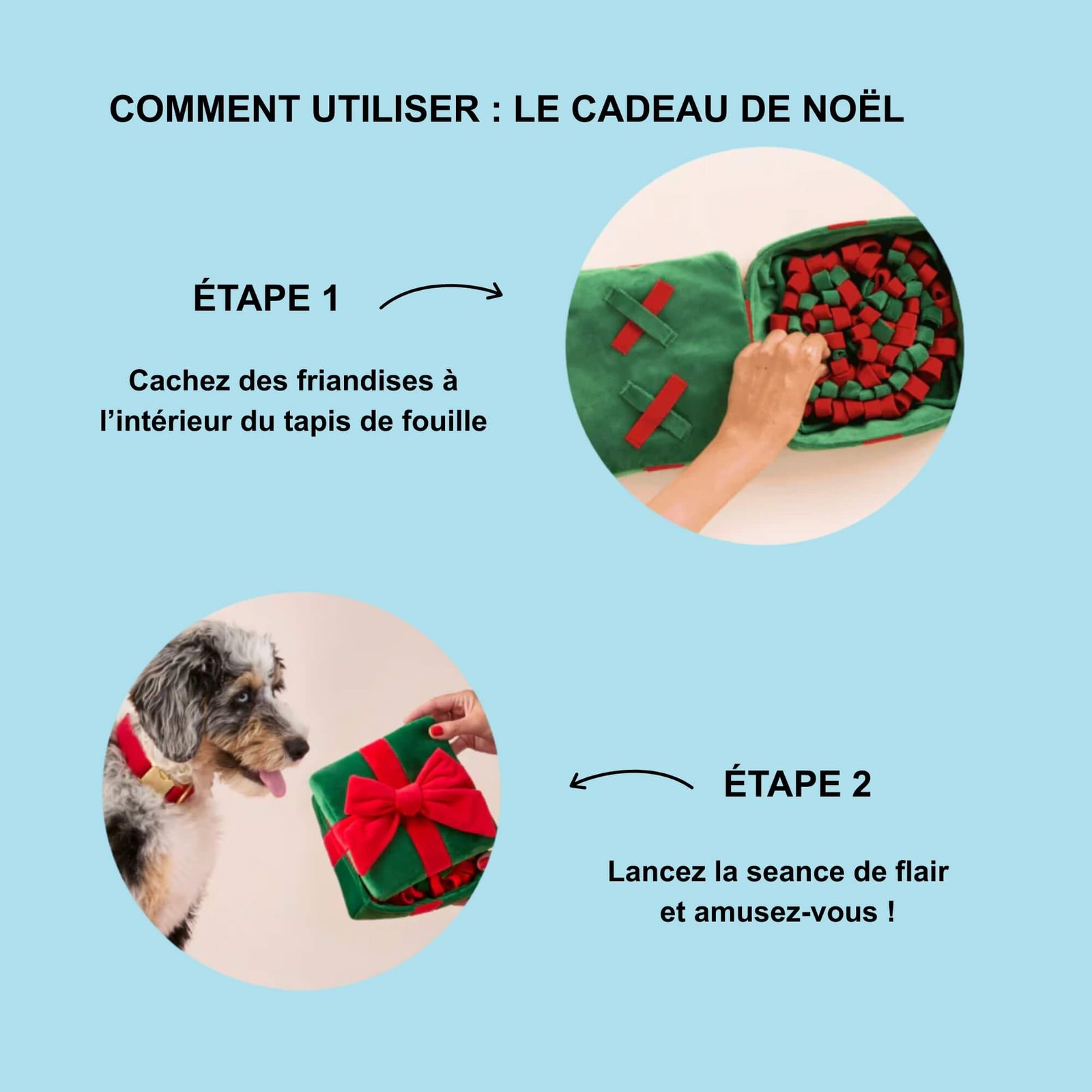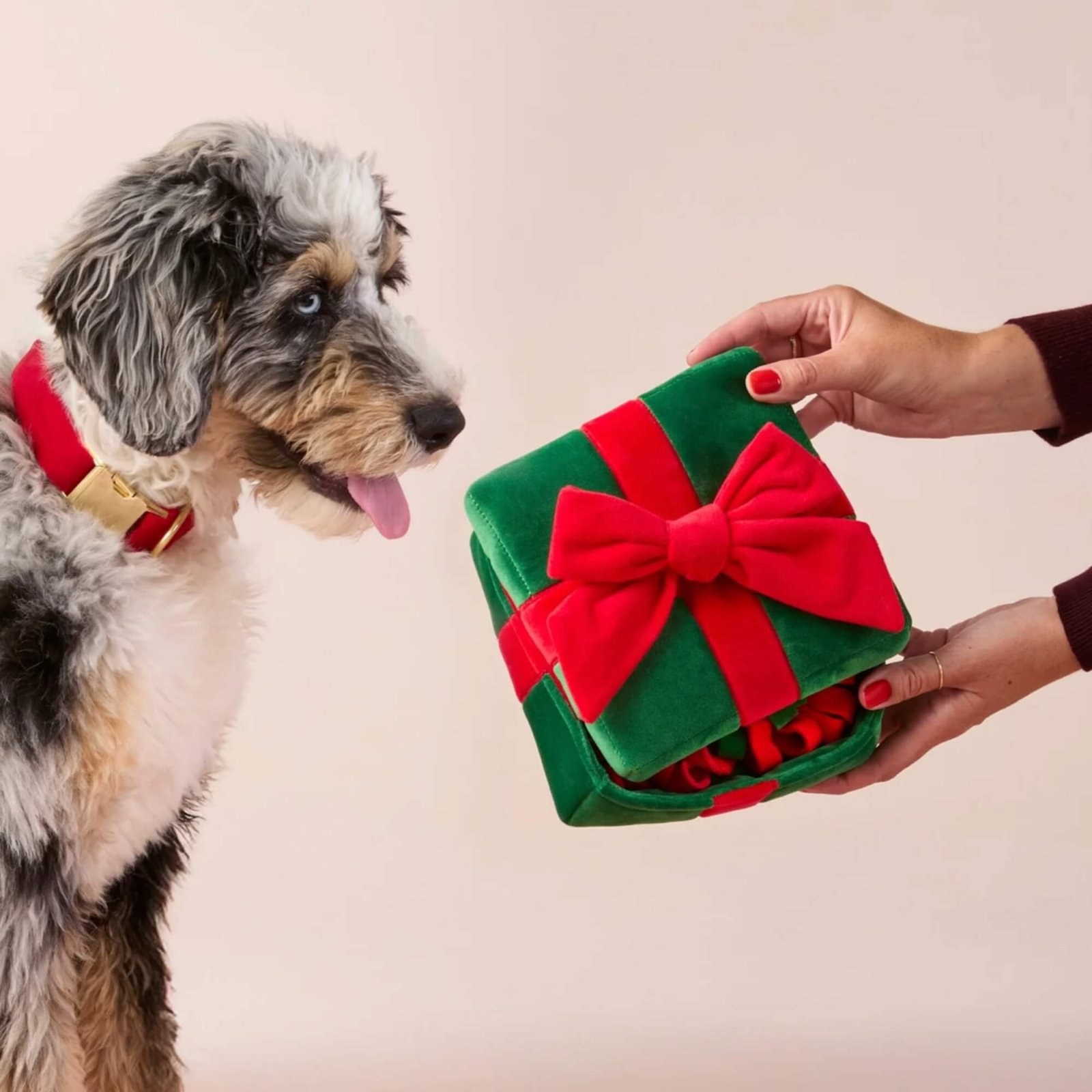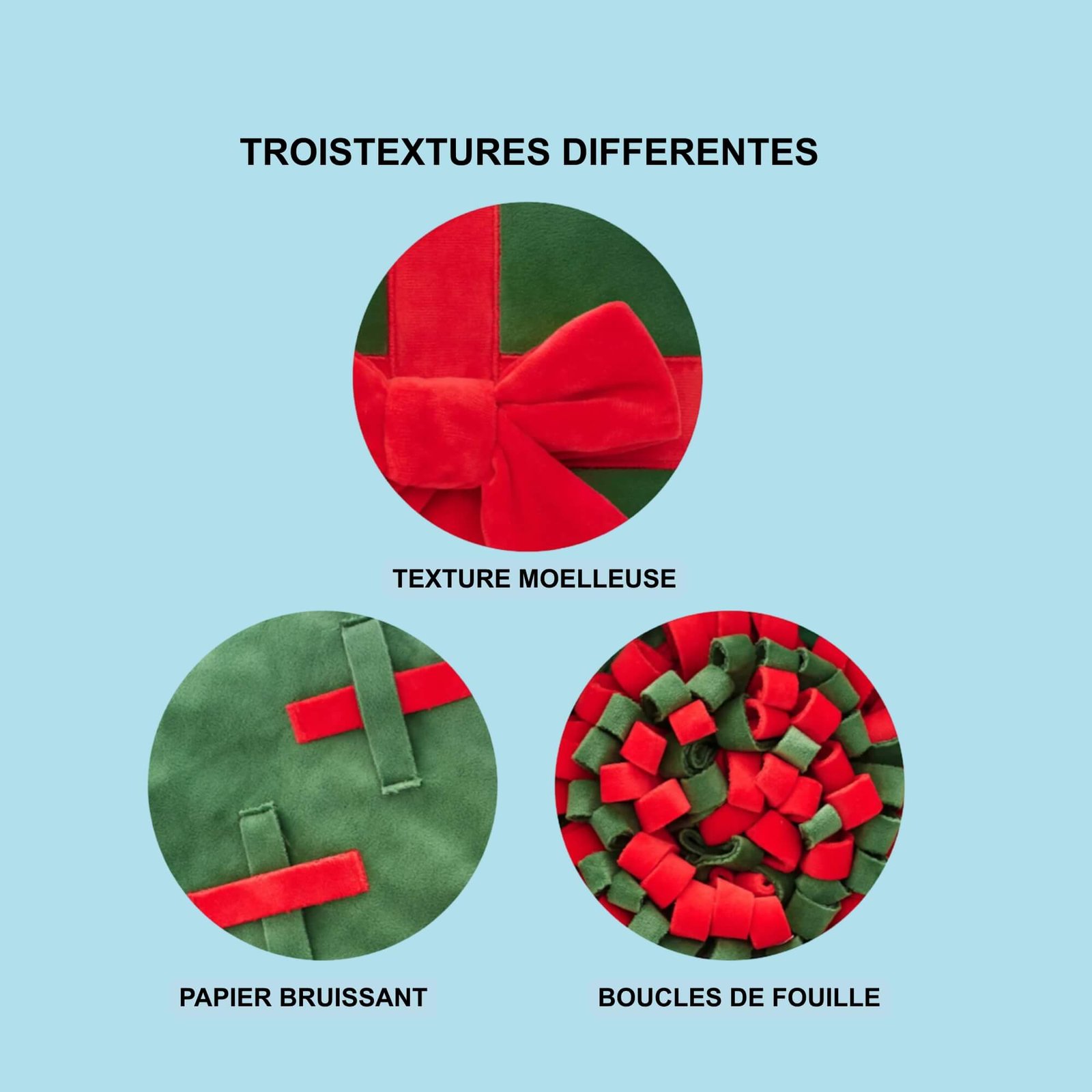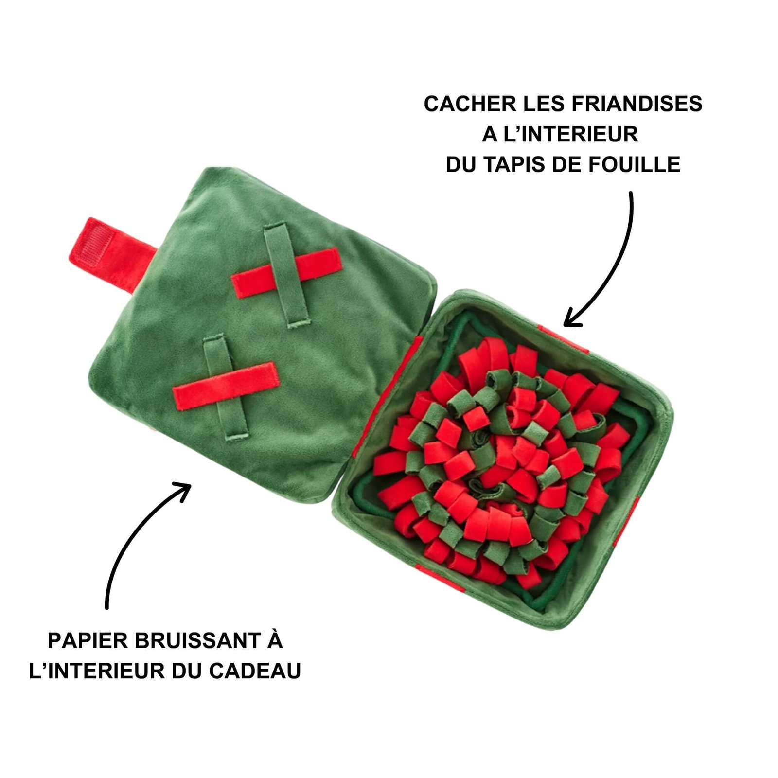 Ce jouet de Noël pour chien signé The Foggy Dog cache bien plus qu’une peluche mignonne : c’est un tapis de fouille dissimulé dans un coffret cadeau en peluche. Sous le couvercle, ton chien découvrira un véritable terrain de chasse aux friandises qui stimule son flair, sa curiosité et sa concentration.
