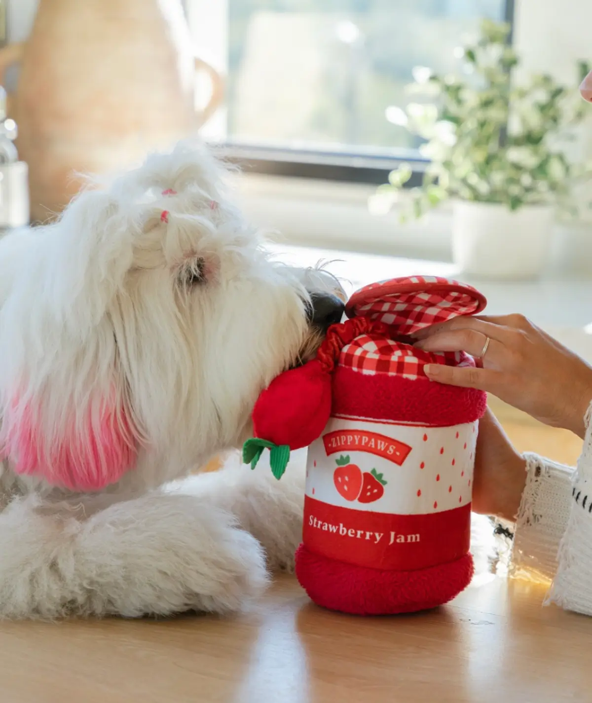 Le modèle « Pot de pâte à tartiner et ses Marshmallows » n’est pas seulement adorable. C’est un véritable outil de stimulation mentale. En insérant les Miniz (petites peluches couinantes) dans le réceptacle, vous créez un défi ludique. La nouveauté 2026 ? Les cordons élastiques. Ils permettent au chien de tirer, de sortir et de secouer ses proies sans que celles-ci ne finissent égarées sous un buffet, garantissant des heures d’autonomie.